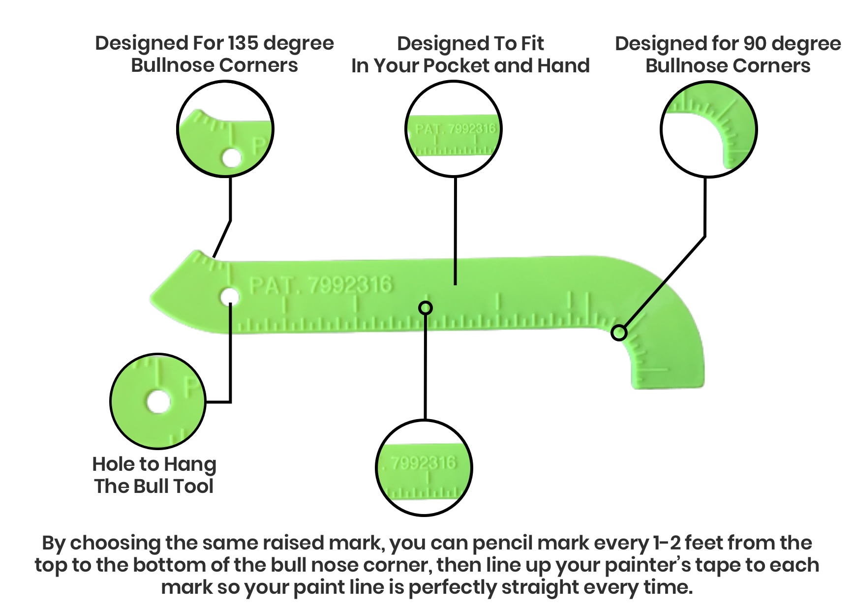 The Solution: the Bull Tool creates a perfect straight even transition line on a bullnose corner every time. It compliments your painting process seamlessly when paired with the Pre-Cut Painter’s Tape.