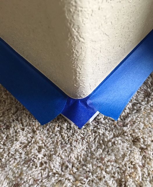 Peel and apply the Pre-Cut Painter’s Tape to the corner of the bullnose corner where the wall meets the baseboard.