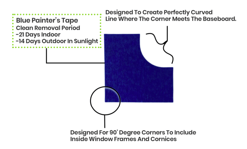 The Solution: the Pre-Cut Painter’s Tape creates perfect even baseboard edges on bullnose corners. It compliments your painting process seamlessly when paired with The Bull Tool.
